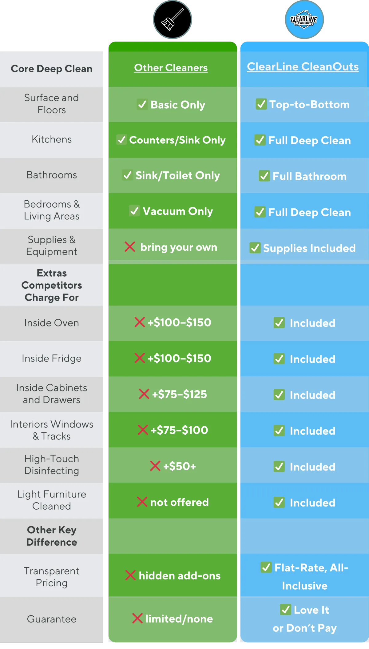 Every package covers full deep cleaning (floors, carpets, kitchens, bathrooms), appliances and all other services outlined in our comparison chart above.